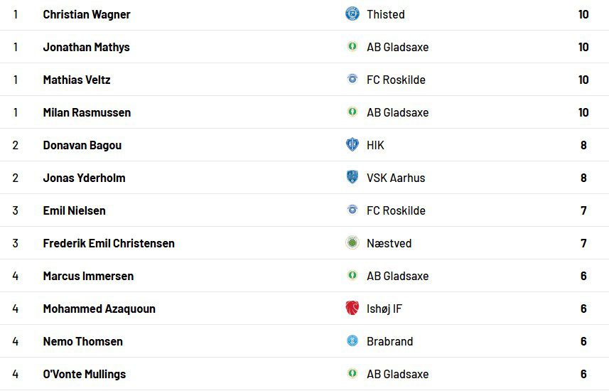 En skade har dog holdt ham ude af de første to runder af sæsonen, og nu udfordres førstepladsen af blandt andet en holdkammerat. ABs Jonathan Mathys har scoret i begge forårets første kampe, og er nu derfor også oppe på 10 kasser.