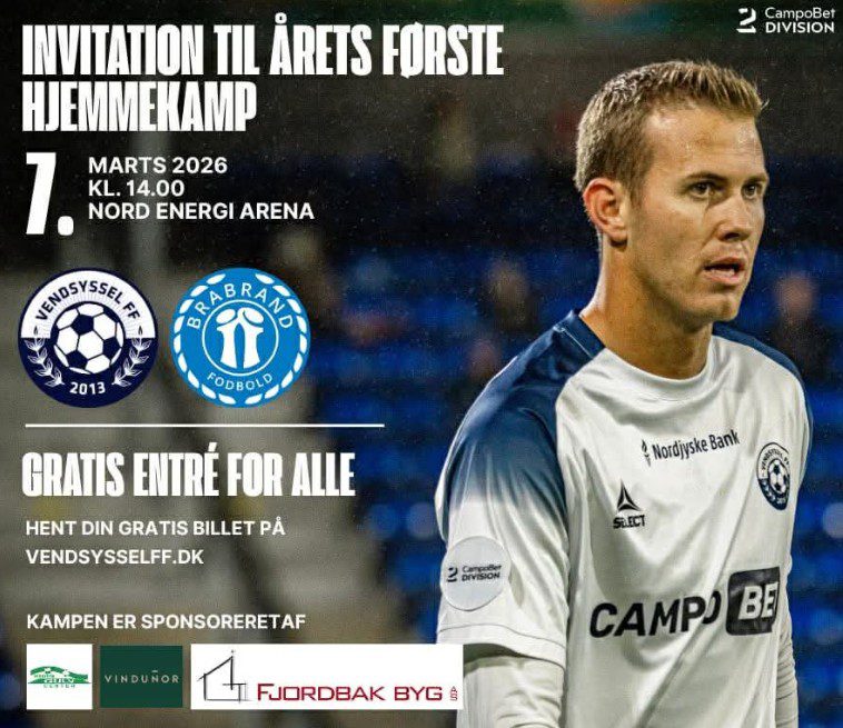 De hentede 21 af deres i alt 27 point mod disse modstandere. Bl.a. via en 3-1 sejr over Brabrand. Vendsyssel FF har spillet syv træningskampe i 2026 og indkasserede kun ét eneste mål. Samt vandt de seneste fem. Men topscorer Lasse Steffensen er i karantæne. Der er kickoff kl. 14:00 og der er gratis adgang.